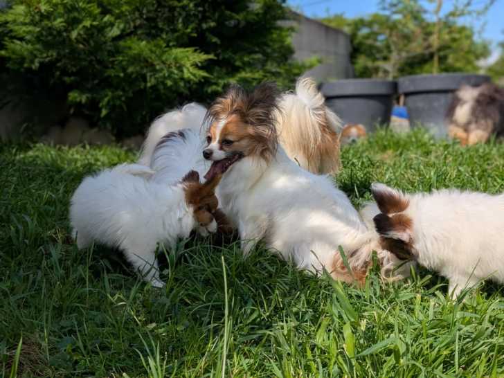 Trois jolis petits bonhommes de race Epagneul Nain Continental Papillon cherchent leurs nouvelles familles.