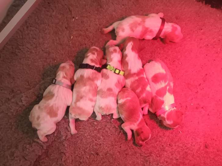 Il reste 4 mâles Épagneul Breton à réserver. Ils sont nés le 05/04/2026. Ils sont de couleur orange et blanc;