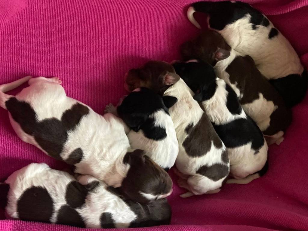 La mère est Reena, femelle tricolore noir fauve née le 25/11/2020. Elle est inscrite au LOF (LOF 317563/40239). Elle est issue du mariage de Bud et Herelle des Sablières de Cadeuil. Elle est issue d'une superbe lignée (Saint-Tugen, Saint-Lubin, De Keranlouan). C'est une excellente chienne de vie et de chasse. Elle sera visible à notre domicile avec ses chiots.