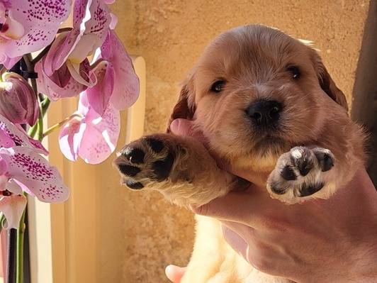 À réserver, adorables chiots Golden Retriever LOF, de couleur fauve doré à fauve clair, nés le 09 mars 2026, issus d’une portée familiale élevée avec beaucoup d’attention. Ils seront disponibles à partir du 13 mai 2026.