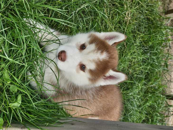 3 chiots Husky de Sibérie sont à réserver à Guéret (23). Il y a 1 femelle et 2 mâles, aux robes blanc et chocolat. Ils sont nés le 20 avril 2025 et seront disponibles début juillet 2025.