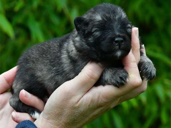 Les quatre bébés se portent bien. Le Keeshond est le plus grand chien de la catégorie spitz : il mesure environ 47 cm au garrot. Ce sont d'adorables chiens de compagnie joueurs et joyeux. Ils seront très proches de l'humain en grandissant et auront une belle robe bleue charbonnée.