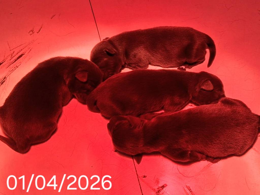 1 mâle et 3 femelles Labrador chocolat LOF, nés le 30/03/2026, sont disponibles à la réservation.