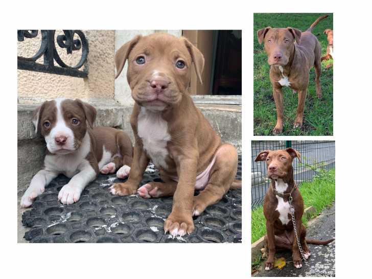 Bonjour, Je mets en vente de magnifiques chiots de type American Pitbull Terrier, principalement de couleur rouge foncé (chocolat) et red fauve clair ou foncé. Les chiots seront en fin de sevrage dans 2...