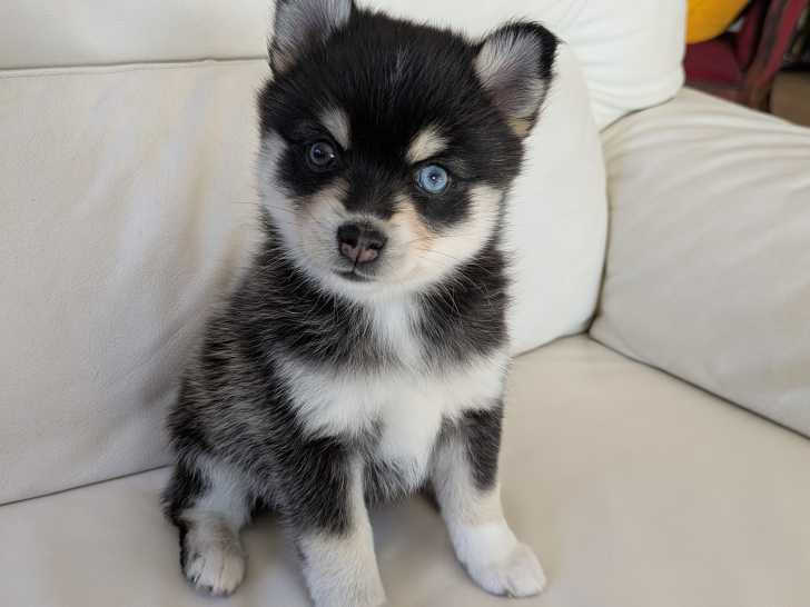 Rare en France, je vends des chiots Pomklee, issus d'une maman Pomsky de gabarit standard et d'un papa Pomklee miniature. Le Pomklee est un chien très équilibré, joyeux et extrêmement intelligent.
