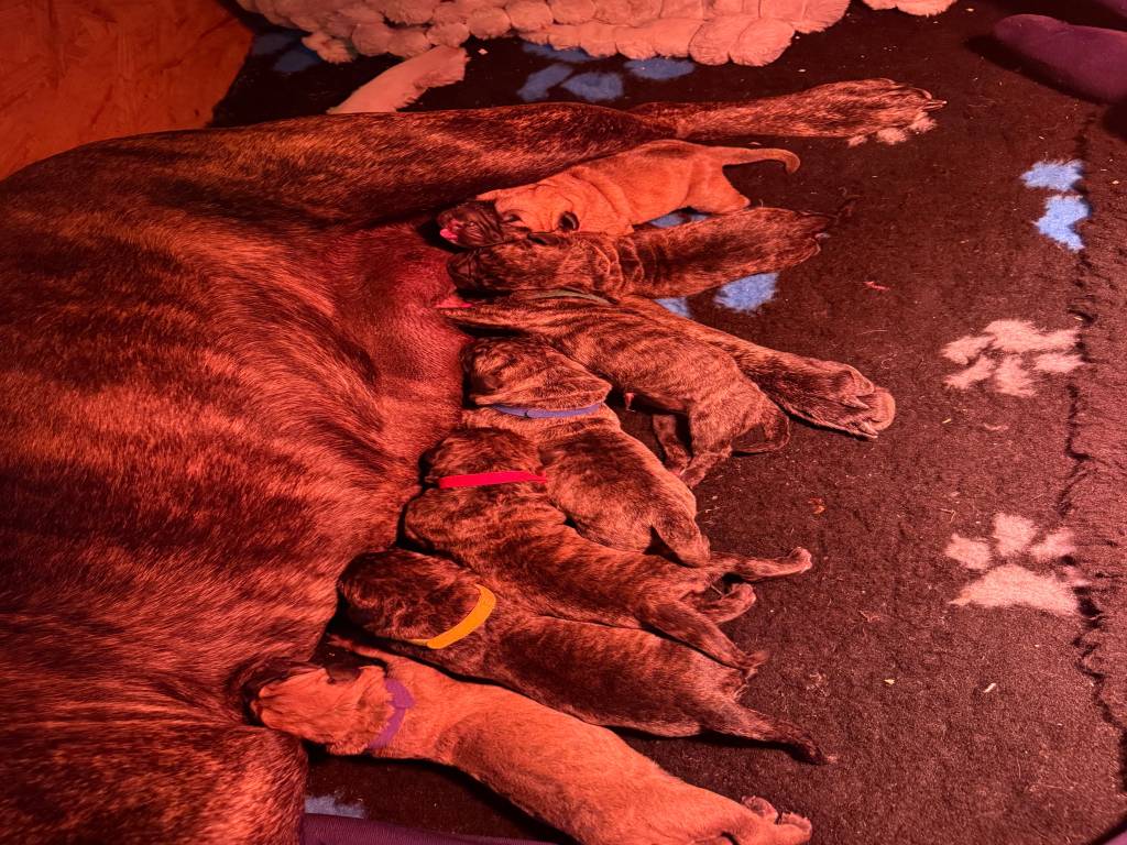 Uzielle Von Den Velay Bergen (femelle inscrite au LOF sous le numéro 6296/992) a donné naissance à 9 splendides chiots Dogue des Canaries. Il y a 4 mâles fauves et 5 femelles : 3 bringées et 2 fauves. Ils...