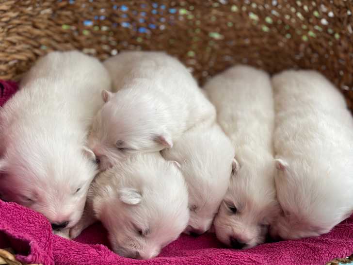 L'élevage du Domaine de la Canelle est heureux de vous présenter une belle portée de sept chiots Samoyède, LOF, nés le 4 octobre 2021. Ils pourront quitter l'élevage début décembre 2021.