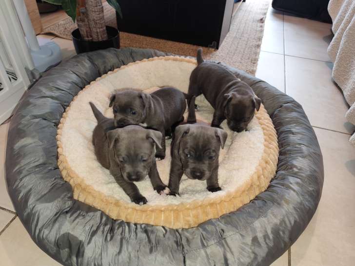 Trois chiots Staffies sont nés dans notre élevage. Les parents sont confirmés et inscrits dans le Livre des Origines Français (LOF) avec tests ADN complets. Ils partiront pucés, vaccinés et avec certificat...