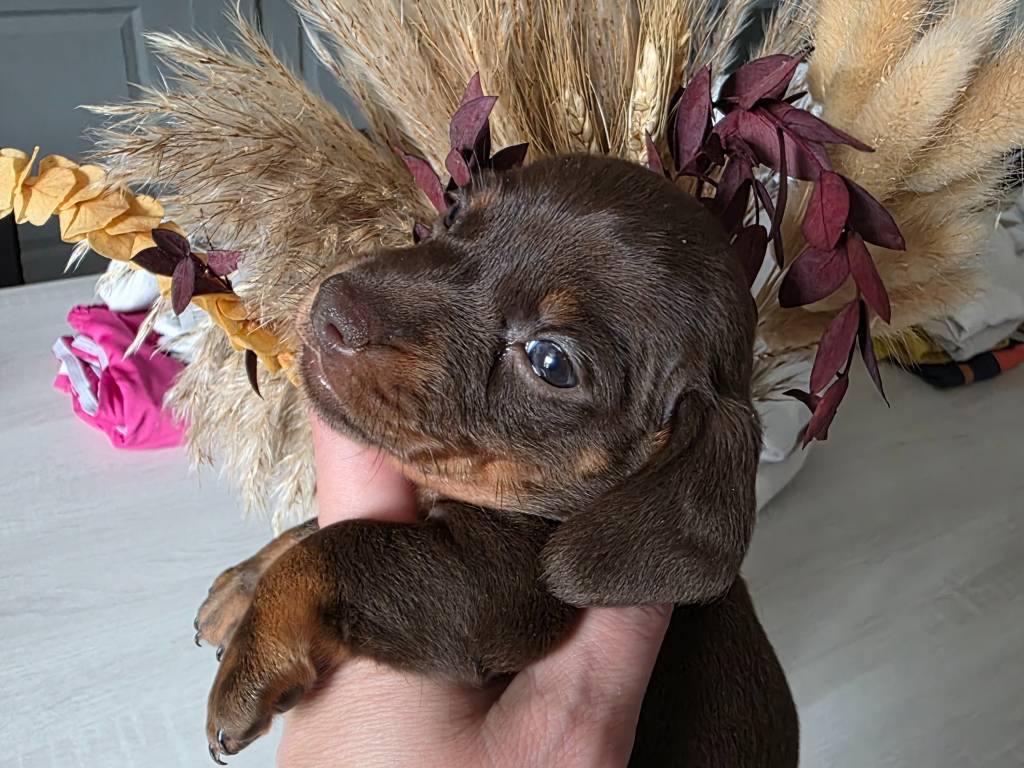 Le Royaume des Minus enchanté est heureux de vous proposer à la réservation 1 magnifiques chiots teckel nain à poil ras, nés le 11 juillet 2025. Ils seront disponibles vers le 5 septembre, à l'âge légal de 8 semaines. Les parents sont testés ADN et maladies.
