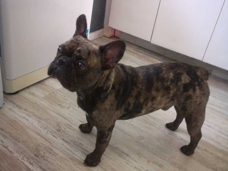 Pookie est un mâle bouledogue Français black merle bringé issu de parents écaille fawn et black merle bringé. Il a un bon gabarit, long et crapu. Il a déjà sailli et est père de 5 bébés (photos sur demande).