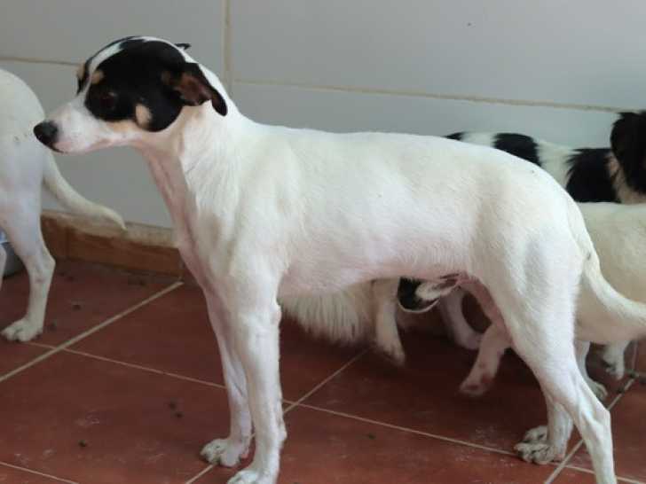 Nous vous proposons à l'adoption Pong, ce jeune chien Bodeguero au pelage blanc avec marque noire âgé d’un an.