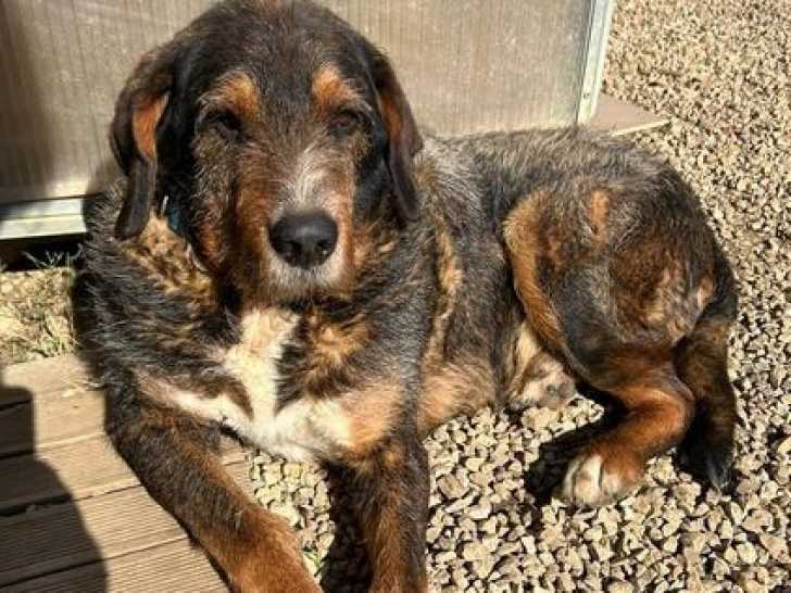 Ce chien Griffon au pelage tricolore et âgé de douze ans nommé Haribo est disponible à l'adoption chez nous.
