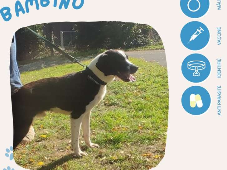 Voici Bambino, un chien noir et blanc, très proche de l’humain et câlin, âgé d’un an. Il progresse dans son poids, marche bien en laisse et apprécie sentir les odeurs. Il aura besoin de sorties régulières, idéalement d’un jardin, et de continuer son éducation.