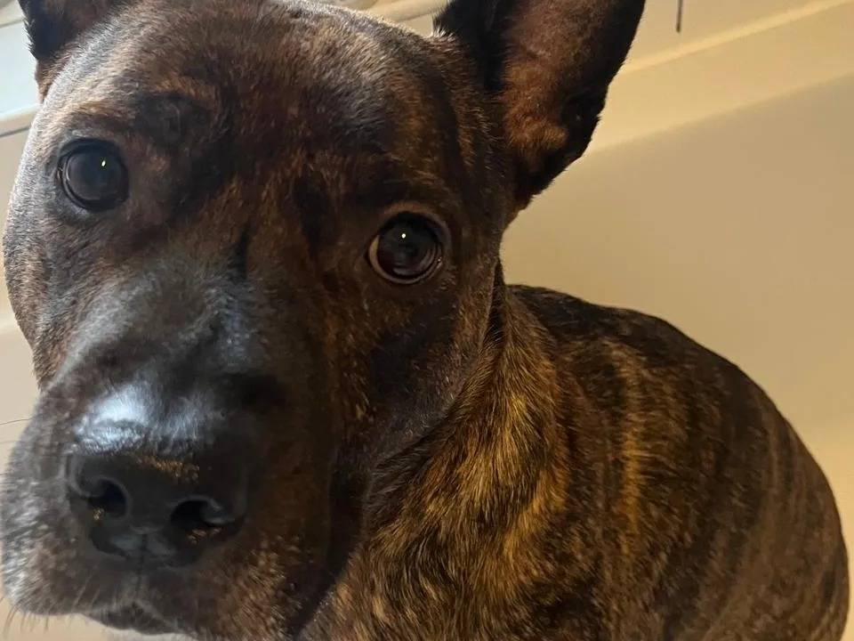 Voici Cosmo, un chien Staffordshire Américain Terrier au pelage bringé de six ans. Équilibré, affectueux et joueur, il apprécie la présence humaine et recherche un foyer doux et stable. Il s’entend avec les chiens patients et tolérants, mais pas avec les chats.