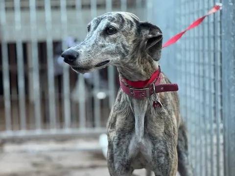 Cette chienne Lévrier Espagnol de couleur bringée et âgée de neuf ans nommée Laïka est disponible à l'adoption chez nous. Celle-ci s’entend bien avec tout le monde, ce qui fait d’elle un excellent compagnon.