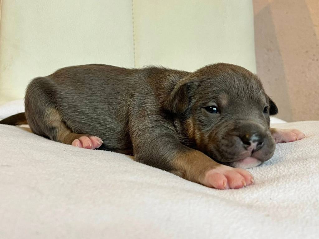 Ce mâle American Staffordshire Terrier évolue avec assurance au sein d’une fratrie composée de 9 chiots. Né le 22 Janvier 2026, il a déjà plus d’un mois et sa silhouette se dessine, avec un air compact e...