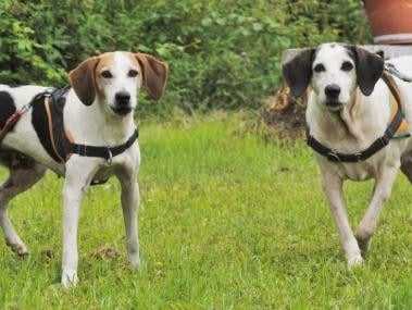 Ficelle et Flèche sont des femelles adultes croisées de type beagle nées en 2009. Elles sont inséparables et doivent être adoptées ensemble.