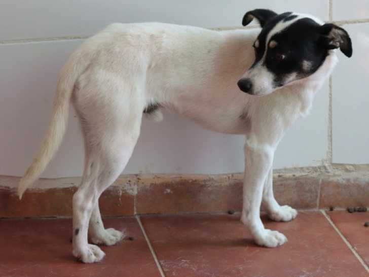 Nous vous proposons à l'adoption ce jeune chien blanc avec marque noire âgé d'un an qui s'appelle Ping.