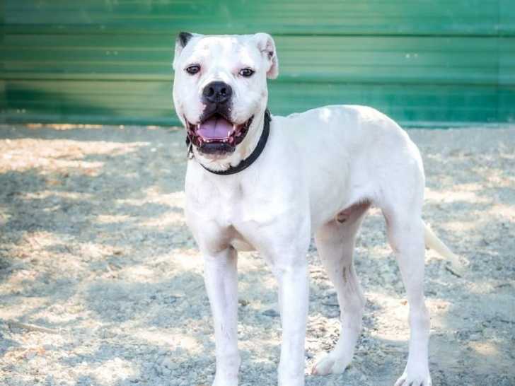 Alaska, un jeune Dogue au pelage blanc, recherche une famille avec un jardin bien clôturé. Ce chien d’un an a besoin d’un environnement sécurisant pour s’épanouir.