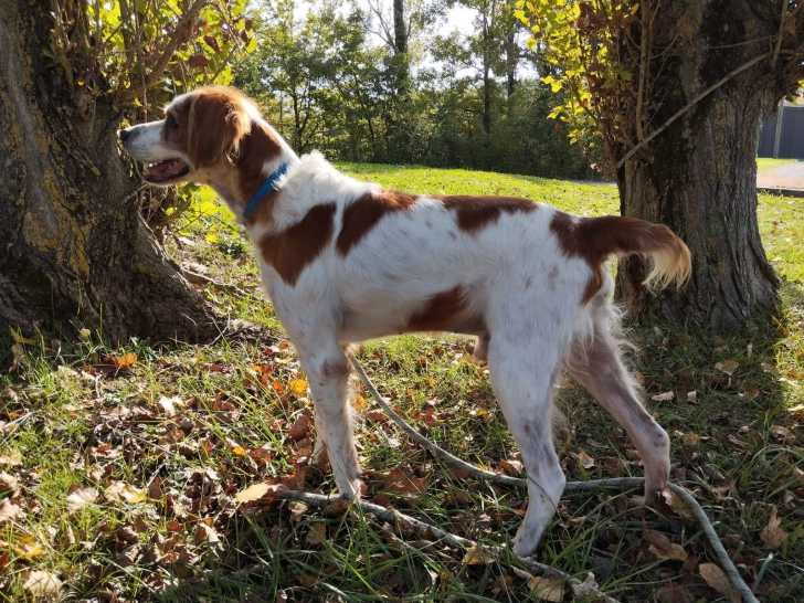 Nous vous proposons d’adopter ce chien Épagneul Breton au pelage roux et blanc âgé de neuf ans nommé Lucky.