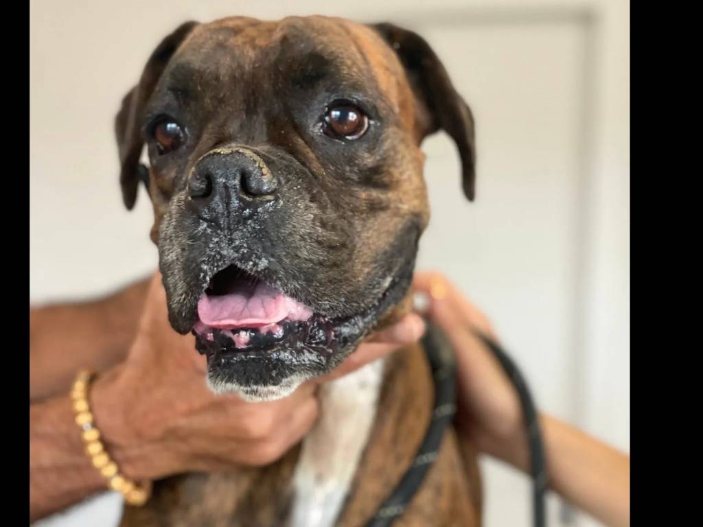 Nous sommes enchantés de vous proposer à l'adoption cette chienne Boxer âgée de sept ans nommée Mirza. Elle se révèle gentille et sociable envers tout le monde.