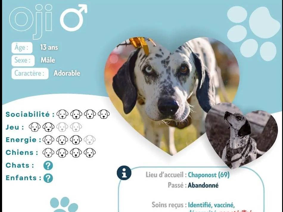 C’est avec plaisir que nous vous proposons Oji, un chien Dalmatien blanc et noir âgé de treize ans, calme, facile à vivre et affectueux, qui apprécie les moments de calme à la maison et les instants de tendresse partagés avec l’humain.