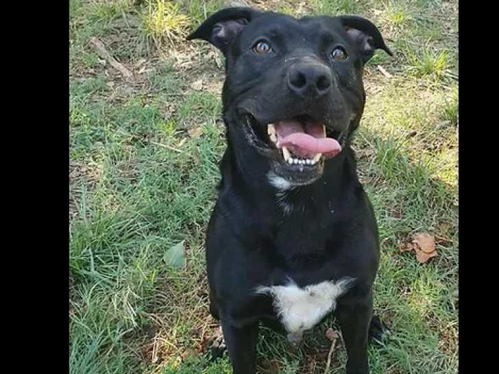 De couleur noire avec marque blanche, Sky II est un chien Staffordshire Américain Terrier âgé de neuf ans que nous mettons disponible à l'adoption.