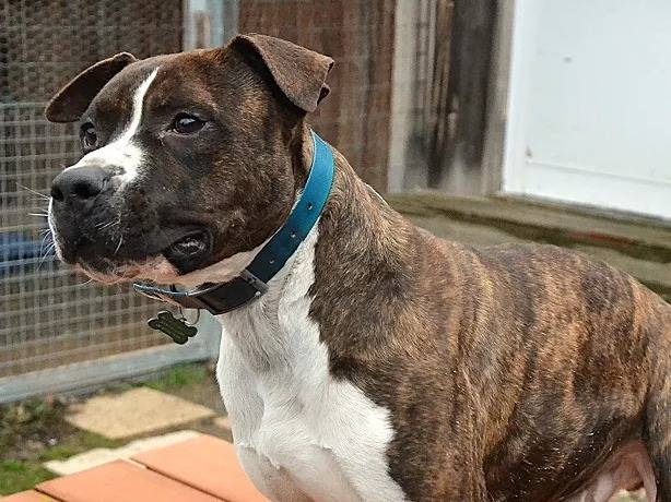 Nous mettons disponible à l'adoption ce chien Staffordshire Américain Terrier à la fourrure bringée de trois ans nommé Tsunami. Il ne s’entend pas avec ses congénères mâles, les chats aussi.