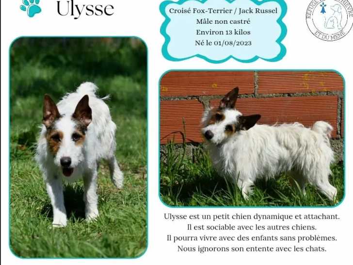 Ulysse est son nom, ce jeune chien Fox Terrier de couleur tricolore et âgé d’un an que nous sommes ravis de vous proposer à l’adoption. Il s’entend bien avec ses congénères ainsi qu’avec les enfants, mais pas avec les chats.