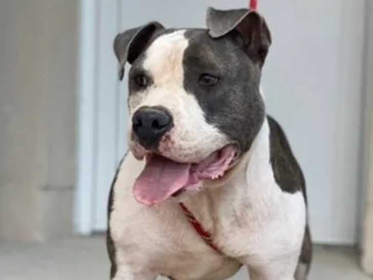 Nous vous proposons à l'adoption Shooter, un chien Staffordshire Américain Terrier au pelage gris et blanc de quatre ans. Il recherche activement un foyer aimant pour la vie.
