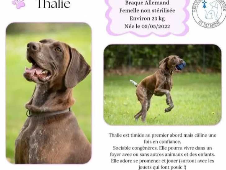 Nous avons le plaisir de vous proposer à l'adoption cette chienne Braque de couleur marron et âgée de trois ans nommée Thalie. Étant une chienne de chasse, elle ne peut pas vivre avec des chats.