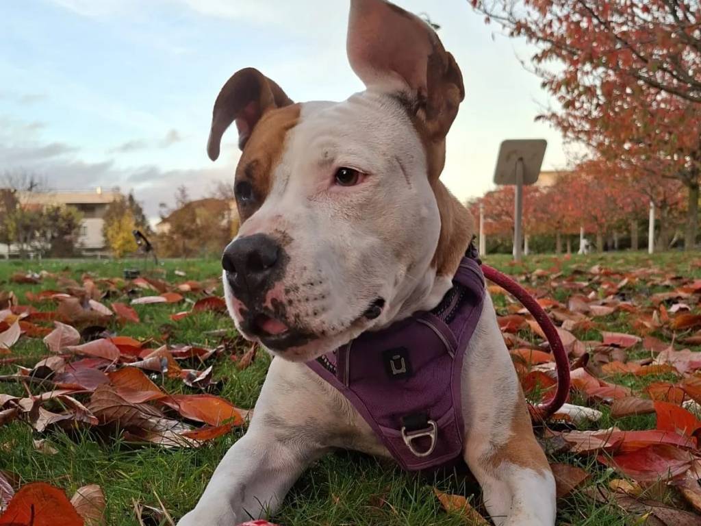 Nous vous présentons Gaïa, une chienne Staffordshire Américain Terrier au pelage marron et blanc de huit ans. Joueuse, fidèle et affectueuse, elle recherche une famille sportive avec un jardin. Elle ne s’entend pas avec les chats et il est préférable d’éviter les enfants en bas âge.
