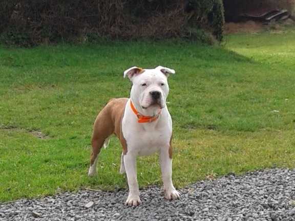 Nous proposons notre mâle bicolore marron et blanc Ne-yo Du Bosquet Aux Loups pour saillie. C'est un American Stafforshire Terrier LOF né en 2017. Il est confirmé.