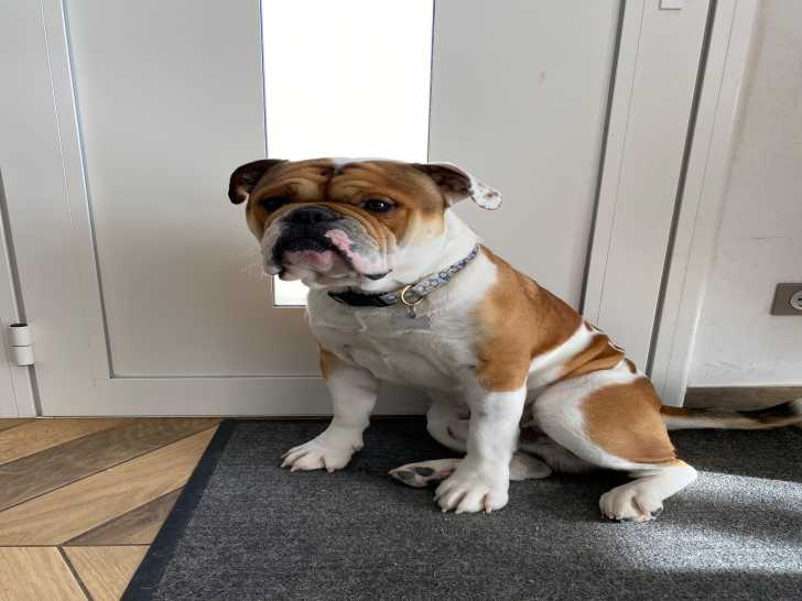 Je suis Pipo du Domaine de Couroules, jeune mâle de 18 mois inscrit au LOF sur 5 générations. Je suis blanc et fauve, avec une gueule brachycéphale bien proportionnée.