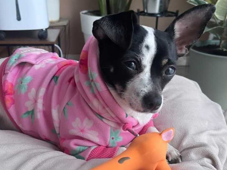 Voici Roxy, une jeune femelle Chihuahua noir et blanc à poil court. Elle est sociable, joueuse et pleine d'énergie. Roxy a un bon gabarit avec ses 3,5 kg.