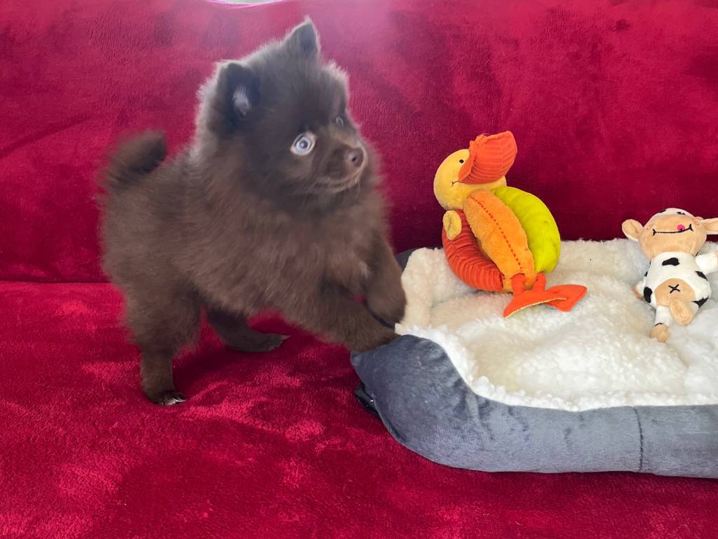 Le Domaine des minipousses est fier de vous présenter une superbe femelle Pomsky Toy couleur chocolat née le 10 Février 2026. Elle fera moins de 4 kg. Sa maman Pomsky pèse 4 kg et son papa Spitz nain LOF pèse 3 kg.