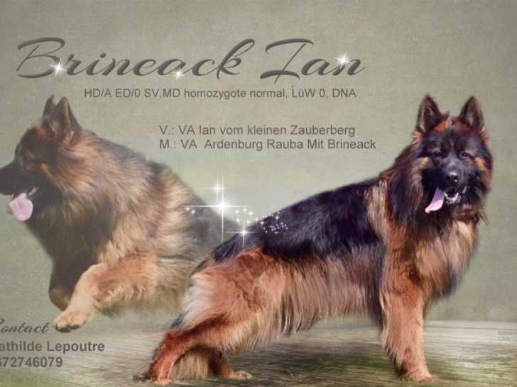 Coucou ! Je m’appelle Ian Brineack. Je suis un splendide Berger Allemand à poil long, couleur noir et feu. Le 10 décembre 2018, ma naissance a concrétisé la rencontre de mes parents CH. Ian Vom Kleinen Zauberberg (double champion du monde) et CH. Rauda Ardenburg mit Brineack.
