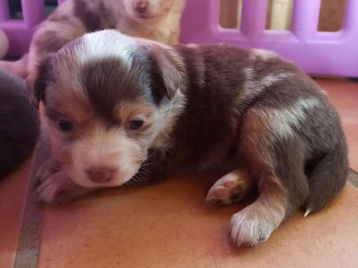 Boline fait partie d’une fratrie de sept chiots nés à l’élevage Aux Couleurs De Sépoura, à Blénod-lès-Pont-à-Mousson le 7 janvier 2026. Ce mâle Berger Américain Miniature est inscrit au Livre des Origines...