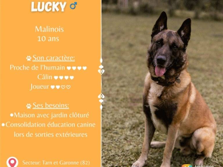 Voici Lucky, un chien Berger Malinois de couleur fauve, âgé de dix ans. Très câlin et proche de l’humain, il écoute bien et adore les interactions. Lucky s’entend avec d’autres chiens mais peut être sélectif...