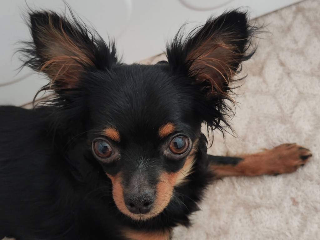 Une magnifique petite chienne Chihuahua non LOF, noir et feu à poil mi-long, est à vendre. Elle est âgée de 1 an et demi. Elle pèse 2,3 kg.