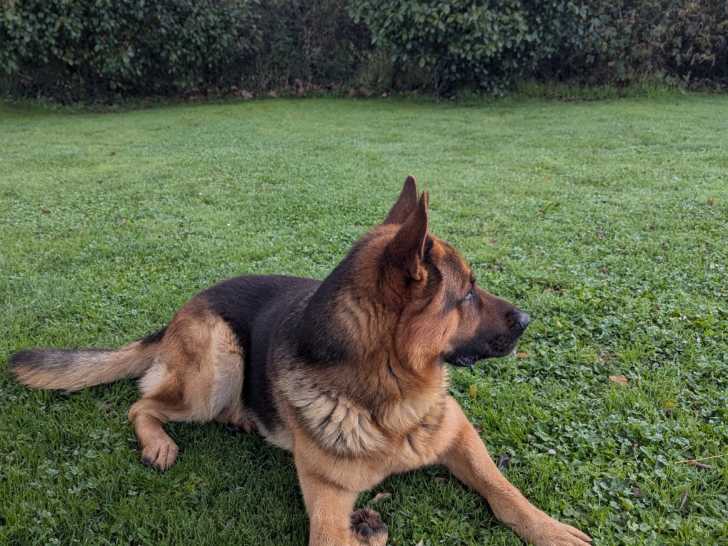 Sogood est un chien exceptionnel tant par sa gentillesse que son obéissance et sa capacité à réguler ses congénères. Au niveau de son gabarit, il fait partie de la fourchette haute des Bergers Allemand : il pèse 47 kg de muscles.