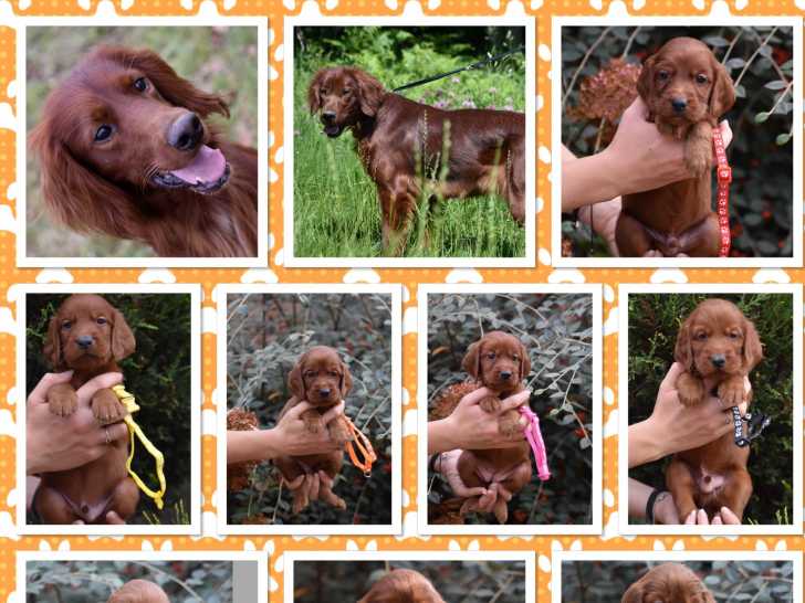 De magnifiques chiots Setter Irlandais rouges, LOF, nés le 25 septembre 2022, sont à réserver. Il y a 5 superbes mâles et 3 jolies femelles. Ils seront disponibles vers fin novembre 2022.