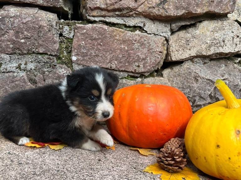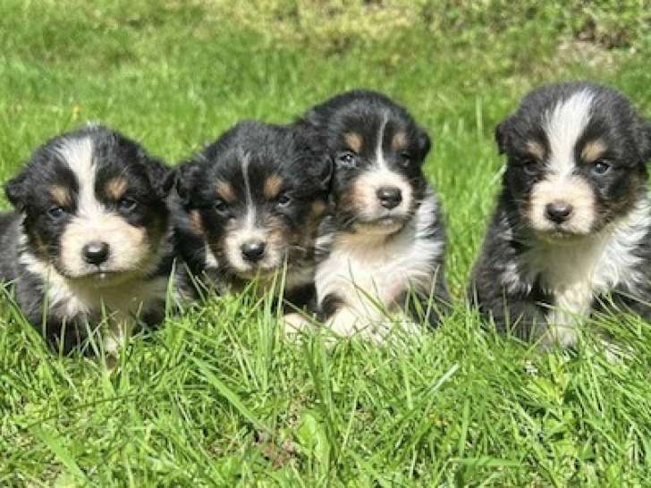 Parmi les chiots mâles, nous avons 2 mâles de robe noir tricolore à la queue longue, 2 mâles de robe noir tricolore à la queue courte naturelle et 1 mâle de robe bleu merle à la queue longue.