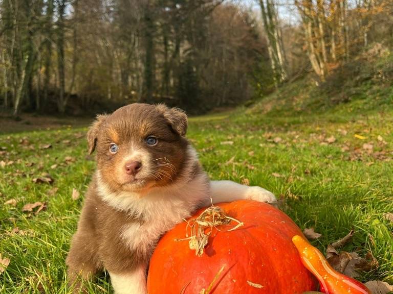 Parmi les mâles nous avons 1 chiot de robe bleu merle, 1 chiot de robe rouge tricolore et 1 chiot de robe noire tricolore. Parmi les femelles nous avons 3 chiots de robe noire tricolore, 2 chiots de robe rouge tricolore et 1 chiot de robe rouge merle.