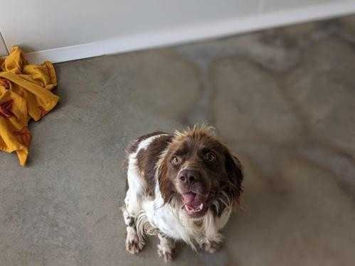 Nous proposons à l'adoption ce chien Épagneul Breton noir et beige de deux ans nommé Booba. Ce dernier s’entend bien avec ses congénères ainsi qu'avec les enfants. Nos chiens ne sont pas à vendre, mais...
