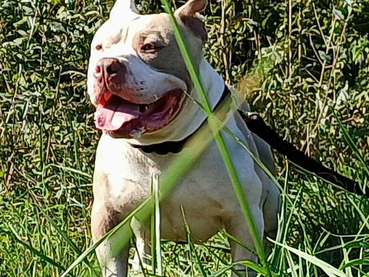 Mon American Bully est disponible pour saillie. Il mesure 44,5 cm au garrot pour 35 kg. Il est inscrit dans les registres ABKC et FBKC.