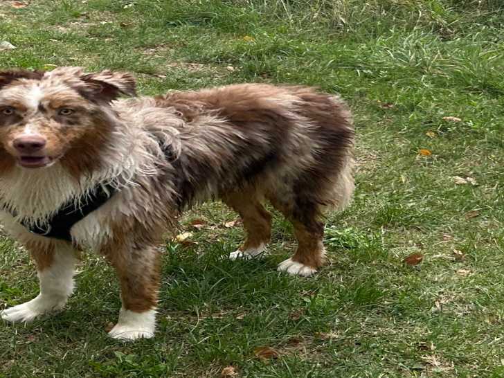 Je m'appelle Aka, je suis un Berger Australien rouge merle né en janvier 2023 dans un élevage du Rhône. J'ai une robe plutôt foncée, une queue longue en panache et des yeux ambre. Je pèse 27 kg et mesure 54 cm.