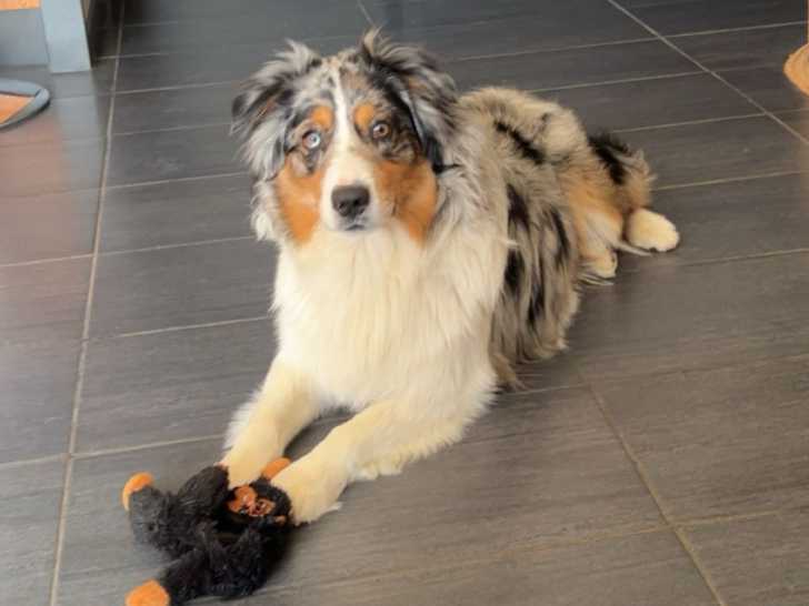 V’Marley du Val de la Licorne est un jeune Berger Australien de 17 mois. Il est très énergique, il adore jouer avec les enfants et d’autres chiens.