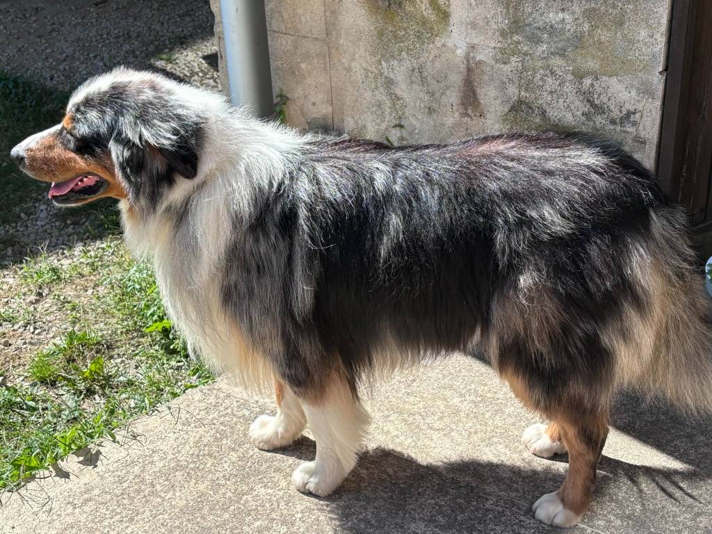 Reiko est un superbe mâle bleu merle, au regard expressif, au tempérament doux et équilibré. Très affectueux, attentif et sociable, il s’adapte facilement aussi bien à la vie de famille qu’à un environnement plus actif.