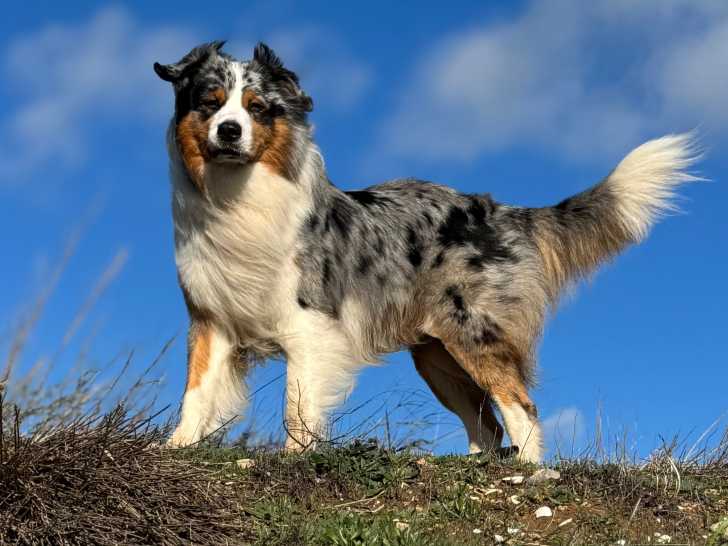 Je propose mon mâle Berger Australien Ulk, à la robe bleu merle, inscrit au LOF (pas encore confirmé), âgé de bientôt 3 ans, pour saillie contre un chiot de la portée en premier choix.